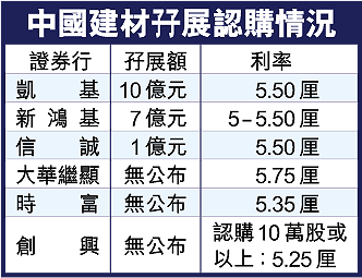 機構投資者對中國建材也相當有興趣。市場昨日盛傳,由於中國建材的國際配售反應熱爆燈,公司可能提早於昨日截止國際配售認購。不過,據了解,中國建材確實有意提早截止配售部份認購,但尚未落實時間。中國建材保薦人是摩根士丹利,每股招股價2.3至2.75元,公開招股本周四截止。