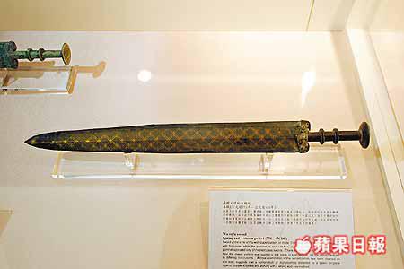 兵器設計也是藝術,如展出的春秋吳國式樣青銅劍刻有菱形圖案,驟看還以為是名牌LV的圖案,部份展品則鑲有綠松石等。展出的一把人面弓形格青銅劍,在大嶼山被發現,他說這青銅時代古物,證明香港早在公元前千多年已有製兵場,十分繁盛。