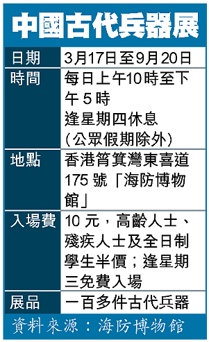 【本報訊】兵器殺氣重重,是戰場上奪取敵人性命的工具,但在海防博物館今日起舉辦的中國古代兵器展中,兵器原來可以是布滿像名牌LV圖案般花紋或寫滿古時文字的藝術品,更是中國帝王霸權統治下,少數民族文化歷史的唯一見證物件。 記者:翁煜雄