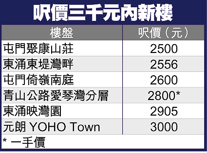 另外,現時市場呎價3000元或以下的新樓選擇不多,美聯新界區董事布少明表示,一手盤包括青山公路愛琴灣分層單位,呎價由2788元起,屯門聚康山莊及倚嶺南庭分別於04及05年開售,當年開賣價也低於3000元水平。
