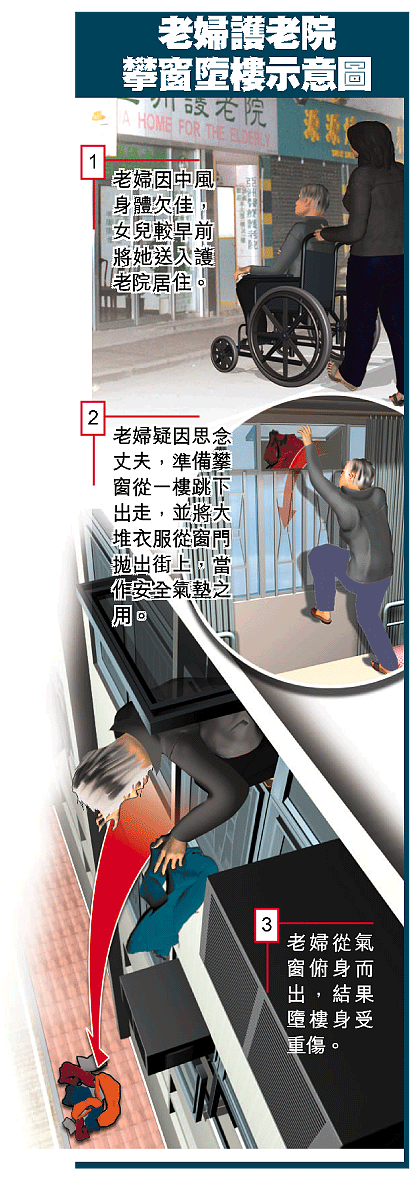 【本報訊】油麻地一間護老院昨日發生院友墮樓事件。一名與丈夫廝守數十載,因中風須入住護老院的七十八歲老婦,在住院兩星期後一直未能與丈夫見面,疑因念夫情切,昨晨在護老院一樓從窗門拋下衣服到街上當「安全氣墊」,然後攀氣窗躍下企圖出走返家,結果墮地身受重傷,經送院急救後,情況危殆。 記者:鄭大康