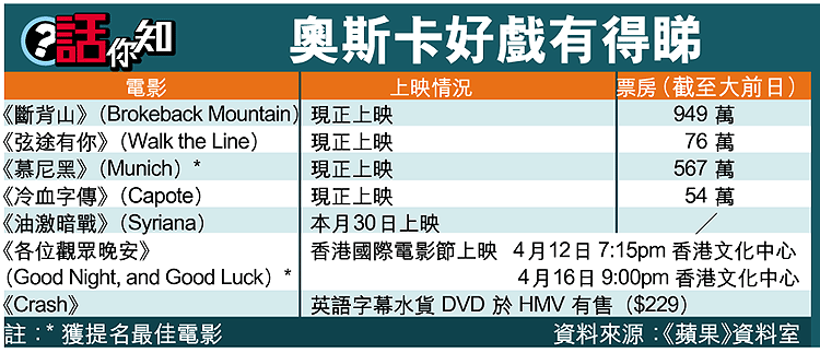 香港電影市道低迷,本地電影製作不斷減少,不少院商都要增購海外電影來應付片源不足的問題,但近日剛在美國奧斯卡力壓《斷背山》(BrokebackMountain)奪得最佳電影、最佳原著劇本和最佳剪接獎的《Crash》,因港發行商不看好票房,至今仍乏人問津。