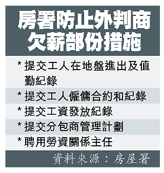 房署副署長馮宜萱說,石排灣邨重建第二期及粉嶺三十六區二期地盤,將於本月底重新招標,預計五月可施工。為減少承建商拖欠工人薪金風險,房署提出多項措拖(見表)。