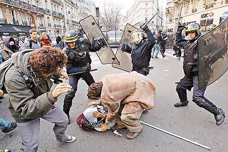 法國學運怒潮,前天(周四)演成火光熊熊的暴力衝突。逾二十五萬名學生,在全法國八十個城市,分頭舉行了大約二百場示威,抗議政府通過新勞工法,准許企業商家毋須解釋就可炒掉二十六歲以下年輕僱員,令他們無保障無前途。但在年輕的怒火下,示威演成暴力,首都巴黎更變成戰場,學生通宵騷亂,推翻汽車、燒書報亭,防暴警察則以胡椒噴霧、水炮、催淚彈還擊,最後暴力拘捕三百人。法國這一刻,如學生憤怒撕碎的藍白紅國旗。