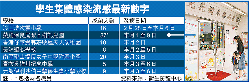 衞生防護中心昨公布本月最新流感監測數字,最少有七間學校爆發集體感染流感,其中葵涌保良局梨木樹託兒園情況最嚴重,於本月初有三十五名學生及兩名職員感染流感,該校校長陳偉賢稱已遵照當局指示消毒校園及校內設施,並採取多項措施防止進一步傳染,包括轉用即棄的紙杯紙碟,以膠袋個別套着學生衣服才掛起,暫時不用安排學生轉換課室上課。