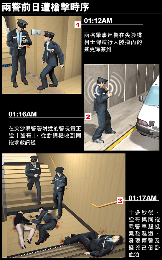 事發後,強哥檢查距離五十米遠隧道內的簽更簿,發現在凌晨一時十二分,案中的兩名巡警才簽到過。他續稱,在短短四分鐘內兩人便告出事,同時牆上沒有血迹,現場亦無掙扎痕迹,估計兇徒早有預謀蓄意行兇,在隧道向兩名警員伏擊。