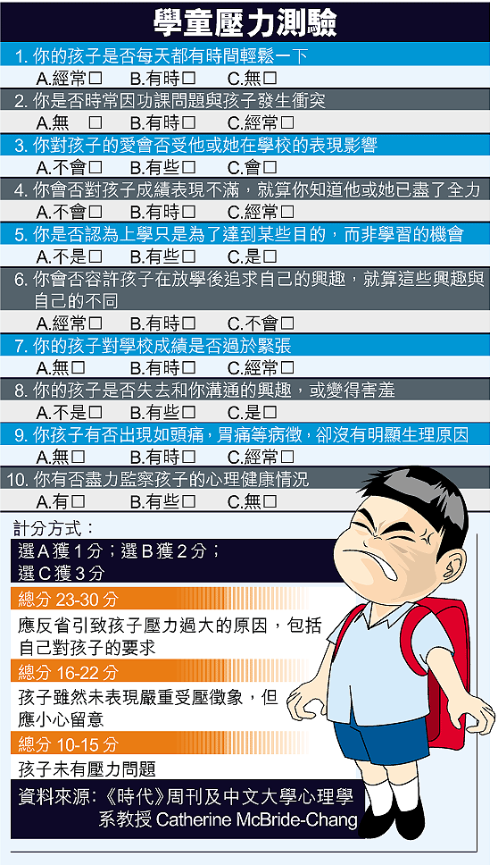 《時代》周刊又與中文大學心理學系教授CatherineMcBride-Chang合作編製了一個簡單的測驗,以測量學童是否過度受壓,父母撫心自問十條與子女有關的問題,就可憑得分了解自己是否過度望子成龍。總得分愈高,顯示子女在學業上受到的壓力愈大,急需為孩子減壓。本報昨邀請了兒子正就讀小學五年級的立法會議員單仲偕試做測驗,測試結果總分為十三分,顯示他並未有給予兒子太大壓力。