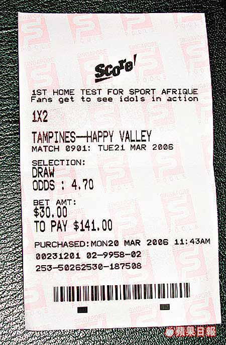 【本報記者李勇明新加坡專電】新加坡較香港早有合法賭波,主客和、首名入球、波膽、半全場及總冠軍的玩法與香港似類,但僅有投注站一種投注渠道,營業時間亦只到晚上七時,與香港多種投注方式及深夜接受投注的做法,策略明顯較為保守。