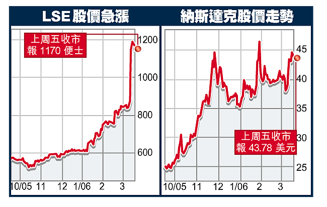 今年以來,倫敦證交所(LondonStockExchange,簡稱LSE)股價漲了近一倍,單在上周就飆升逾三成,這應歸功於納斯達克股票市場(NasdaqStockMarket)出價42億美元(約327.6億港元),收購這家有數百年歷史的交易所。