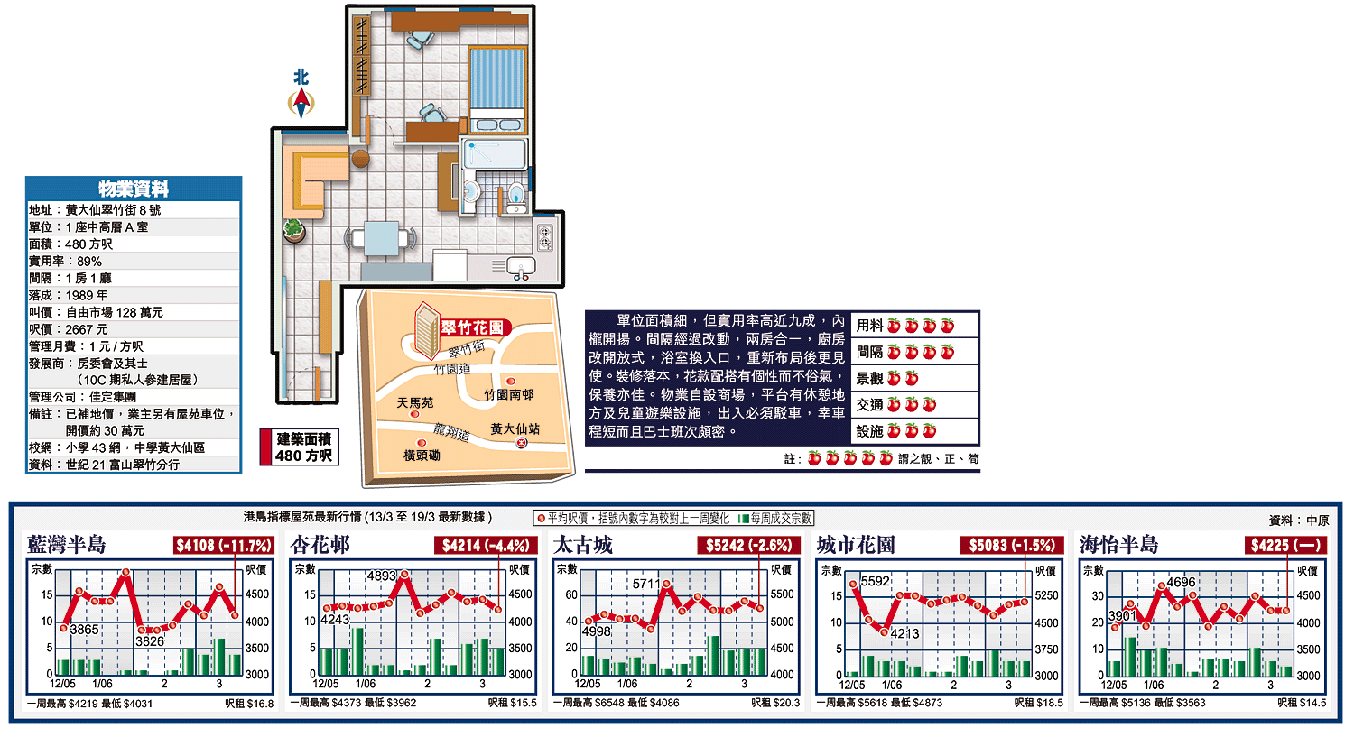 成交方面,3月中5座中高層A室,480方呎,以自由市場價118萬元易手,呎價2458元。