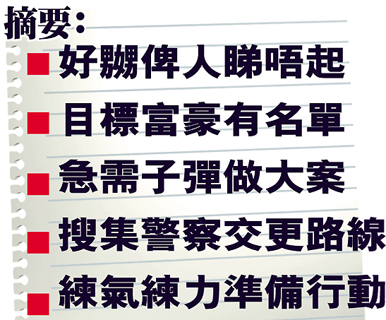 另外,警方前日在記者會中表示,警方調查相信,兇徒殺警目的只是為了搶槍,現正調查他若果成功搶得槍後有甚麼進一步計劃。其實,「魔警日記」中亦早見端倪,警方在日記中發現「急需子彈做大案」的字句,並附有一些香港富豪的名單,警方不排除他準備在搶警槍後向某些富豪下手,至於其下手計劃,警方仍在研究「魔警日記」內容,希望有進一步發現。