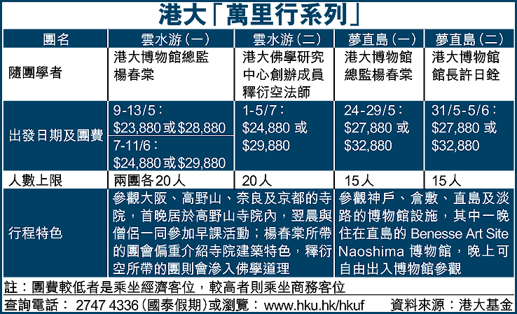 這批旅行團由港大基金與國泰假期合辦,分兩個系列,共有五團於五、六月間出發,全部以遊覽日本京都及大阪等關西地區為主(見表)。港大發言人表示,扣除成本後,餘額將作為捐款撥入基金;若這次活動受市民歡迎,日後將再辦同類的旅行團。