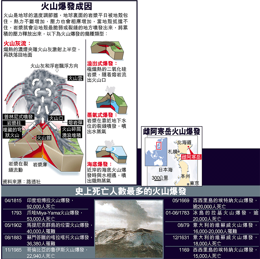 北海道西部九三年七月發生的地震引發海嘯,導致二百三十人死亡。○三年九月,北海道也發生一次黎克特制八級大地震,地震導致四百多人受傷,當時釧路也是重災區之一。九一年,日本南部九州一個火山發生火山爆發,警察、消防員和記者等四十三人,被混雜蒸氣、火山灰和石頭的混合物灼死和砸死。