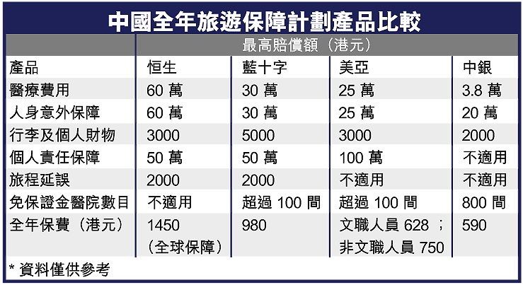 不過,市場上的中國全年旅遊保險計劃,保費相差甚遠,可以倍數計算,因此投保前宜多加比較,清楚了解各個計劃的保障範圍,看是否切合個人實際所需。