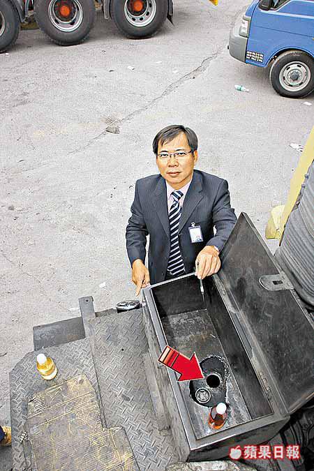 海關經深入調查後,昨早上七時二十分,二十名關員趁車場開門時,截停四輛駛出的貨櫃車檢查油缸內的燃油,發現並無問題,其後仔細檢查,發現貨櫃車的油缸全被人改為隔層缸,缸內有缸。油缸內加裝有一個小油缸連接正常的油缸口,存放小量的油渣供抽查,另又在油缸的其他位置開一個入油口,注入大量的紅油供行車之用,並以物件例如工具箱遮蓋紅油入油口,若不小心檢查難以察覺。