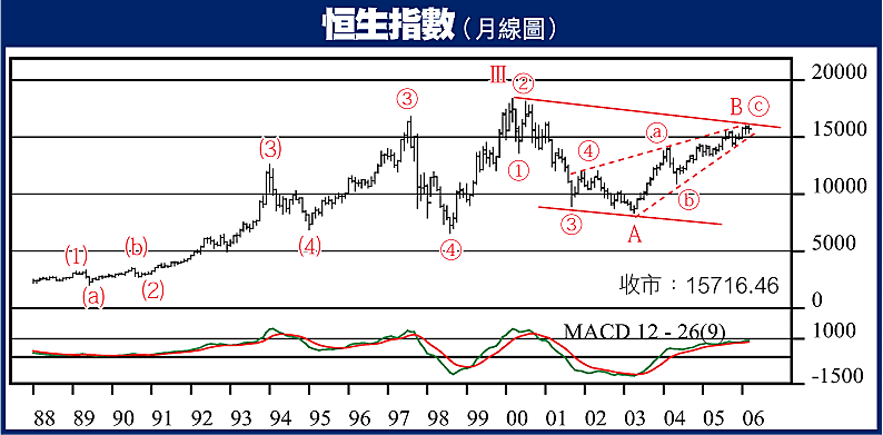 恒指00年最高18397,以大雙頭走勢展開Ⅳ浪跌市,其中A浪跌至03年最低8331,共跌10066點,B浪如反彈0.764,阻力16021。