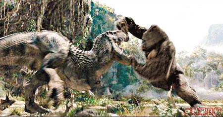 女主角逃走時遇上暴龍追襲,金剛及時英雄救美,初時與1隻暴龍單打,後來被3隻圍攻,右手夾住1隻,左手緊握女主角,右腳撐開第2隻,點知被第3隻咬到左手,之後打到半天吊兼且滾落山,以一敵三最終打贏,但打到爆頭流血,筆者睇到握實拳頭,心痛!