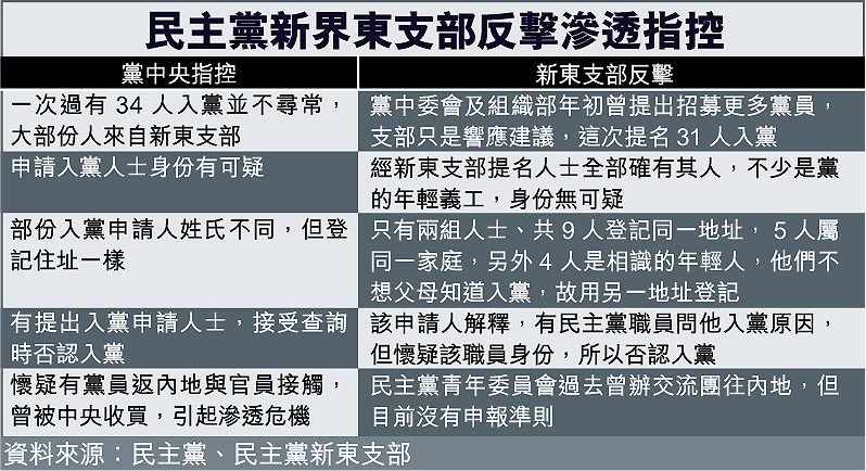 【本報訊】民主黨懷疑被北京滲透事件,演變成主流派及少壯派內鬥升級。民主黨六名年輕黨員聯同黨副主席陳竟明,昨日高調公開澄清從來沒有被滲透收買,被黨中央指有可疑的十多名入黨申請者,都是經他們提名,全部有名有姓有住址。不過,有民主黨核心成員質疑,少壯派積極拉攏新人入黨,只為在本年底黨領導層改選「種票」,到時便夠票更換整個領導層。 記者:莊曉陽、莫劍弦