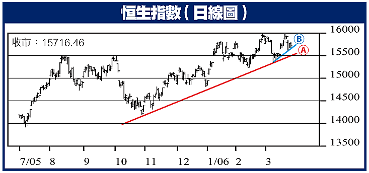 以近期的恒指走勢而論,中線上升軌始於10月28日(線A),短線趨向線(線B)始於3月8日,現時兩線仍未跌破,不能看淡。另外,3月8日-14日之島形底,確認於3月15日之上升裂口,故此,此裂口絕不應補回,否則,市況或有逆轉之可能。此裂口介乎15550-15650點,只是兩個重要的參考位。至於頂部阻力,回看過去3天,大市都受阻於15800點,只要指數企穩15800點之上收市,後市便會3次上試16000點阻力。因此,現時的市況只是待變格局,大家在等,等待突破訊號。