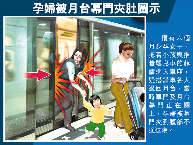 【本報訊】地鐵發生幕門夾人意外,一名孕婦昨日在九龍塘站乘搭地鐵,她與菲傭及一名小孩進入車廂後,懷疑搭錯車退回月台,其間車門及月台幕門關上,孕婦被幕門夾到腹部感到不適,送院檢查證實胎兒未受傷害,她經觀察無礙已出院。 記者:吳國威