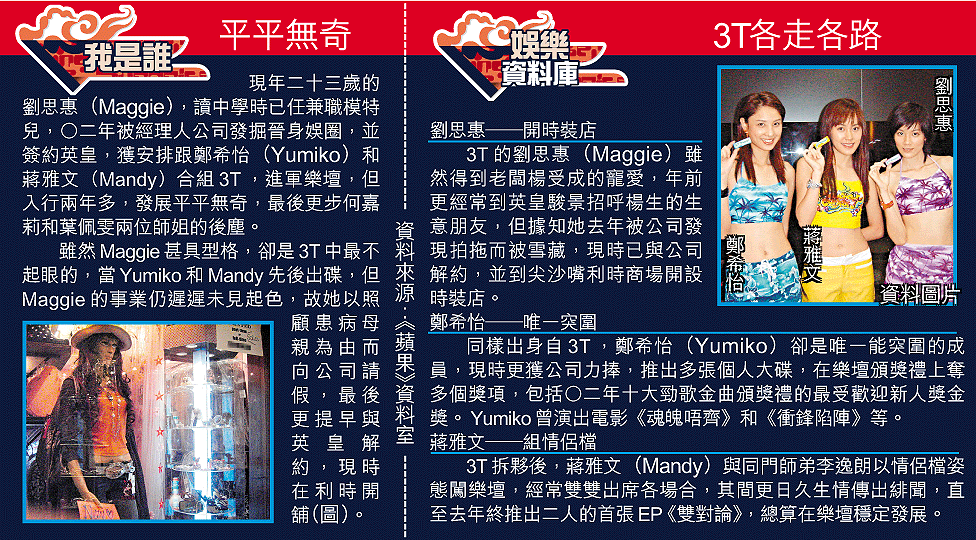 劉思惠、鄭希怡(Yumiko)和蔣雅文(Mandy)○二年組成英皇3T小花,推出EP《少女碟》。當時被喻為「翻版王菲」的Maggie,出碟前被公司看好彈出,想不到被黑馬Yumiko跑贏,