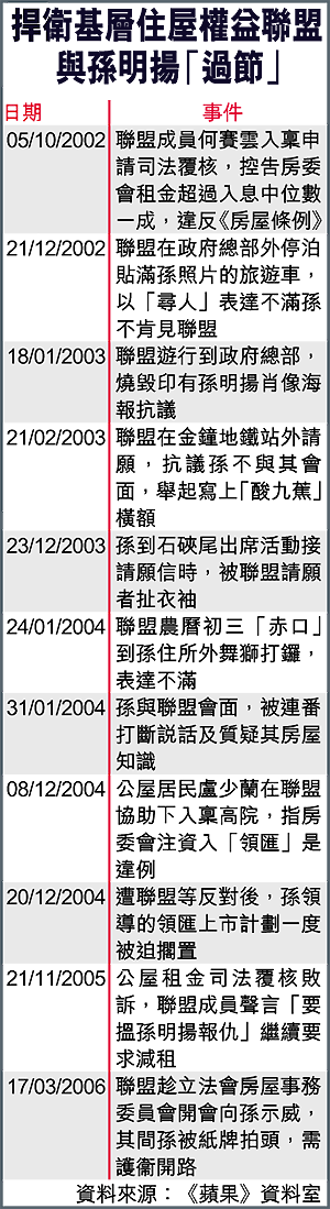 聯盟代表張文慧表示,孫曾於二○○四年一月出席聯盟舉辦的居民大會時,承諾在公屋租金政策檢討諮詢時,再次出席居民大會。本月初,孫卻拒絕出席聯盟原定於昨晚舉辦的居民大會,「出爾反爾」。有請願人士拍打其座駕,令車尾箱蓋出現輕微凹痕,兩名請願者則坐在車前擋路。警方遂增派人手,以人鏈方式將其座駕與請願人士隔開。