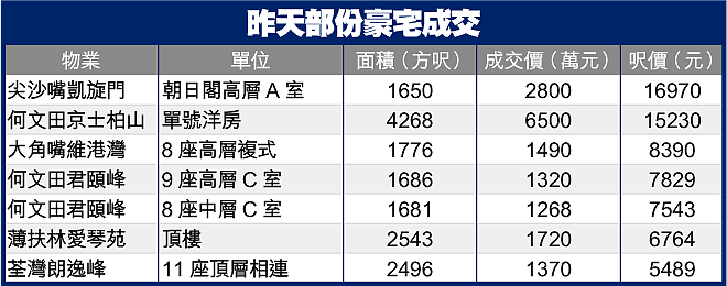 另外,港、九及新界區豪宅屋苑,昨天均錄得特色單位成交,其中大角嘴維港灣海景複式,呎價近8400元易手,原業主去年10月以1328萬元購入,持貨半年轉手,賺162萬元,物業升值12.2%。