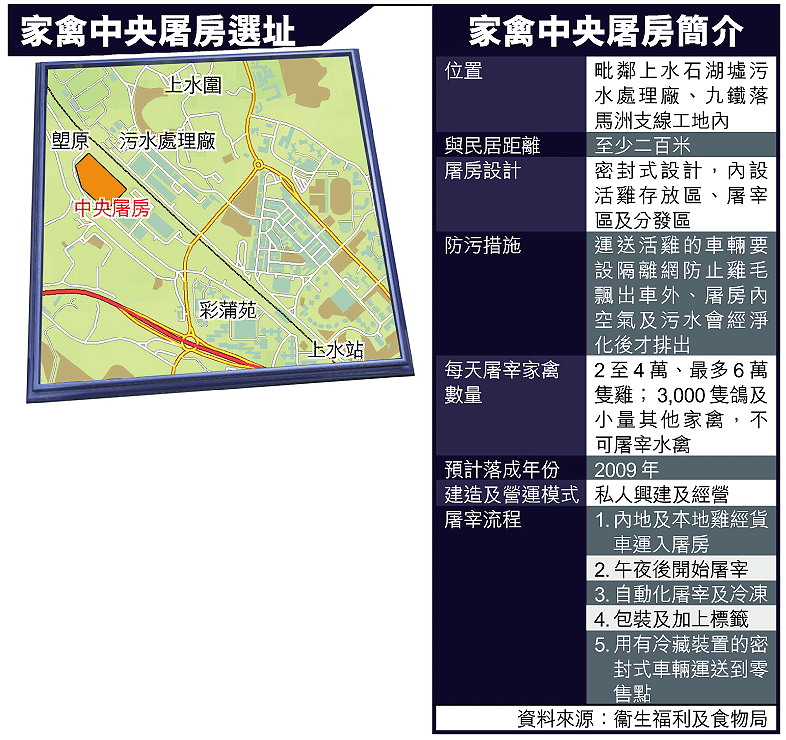 衞生福利及食物局擬定的中央屠宰場,位於上水離民居二百米的九鐵落馬洲支線工地內其中一幅一萬平方米用地,預計明年七月通車後有關用地會交還政府,當局會於今年稍後招標,屠宰場由私人承辦商興建及經營,估計費用二億,稍後進行環境及交通影響評估,最快○九年落成。