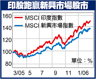 近期印度股市升勢如虹。截至2月28日止的過去一年,印度股市市值以美元計已上升了50%。儘管期內其他新興市場表現普遍強勁,但印股的升幅仍然比上升了37%的摩根士丹利新興市場指數多出13個百分點(見附圖)。