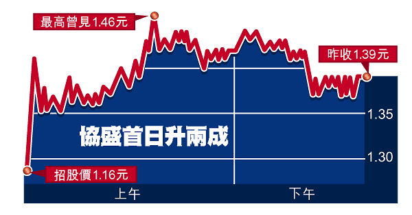 協盛昨掛牌延續近期新股升勢,較招股價高近20%,散戶每手賺336元,左為主席施少雄,右為執董蓓蕾。