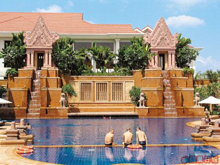 我還享用過由新加坡人主理的Sokha酒店設施,以吳哥古迹設計的泳池也很漂亮,可惜地方不大,但小朋友最愛在泳池旁那個陰陽混合體的石像上跳水,女士則愛留在太陽傘下,雖試了兩個泳池,可惜未遇上樣靚身材正的三點式美女,反而看到三位白口雪口雪的英國男人,齊齊坐在池旁,我們膚淺地大說他們玩斷背「三」,難怪同行男士大呼失望!