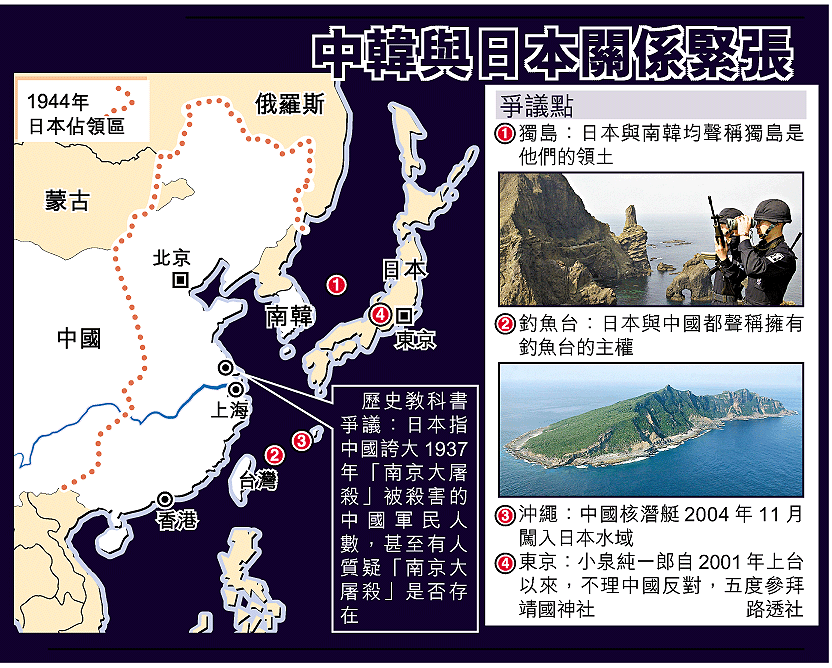 日本政府前晚(周三)公布對明年度高中教科書的審定結果,要求出版社在教科書中明確把釣魚台(日稱尖閣諸島)、獨島(日稱竹島)、沖鳥島列為日本固有領土,並淡化慰安婦、南京大屠殺和首相小泉純一郎參拜靖國神社的字眼。日方公然美化戰時侵略行為,引起曾飽受日軍鐵騎蹂躪的中國和南韓的強烈抗議。