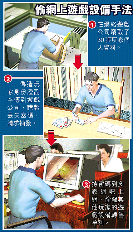 警方很快查明,一個叫顏億凡的遊戲玩家於○四年,曾經短期聘用做網易《大話西遊Ⅱ》兩周年慶活動的工作人員。通過接待遊戲玩家,他拿到玩家資料三十多張。他透過偽造玩家的身份證等手法拿到安全碼,然後在數個網吧裏將那些玩家的「神獸劍精靈、猴精、斬妖劍」等「裝備」分別賣出,獲利近四千元。