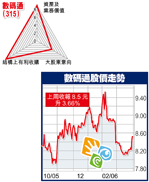 大股東意向︰數碼通的大股東為新鴻基地產,持股量達53%,大股東資金充裕,所以無必要接受任何善意收購的建議。股價長期受壓的主要原因,便是股價無任何反映可被收購的溢價。電訊業務已成明日黃花,新地可能將數碼通賣掉。(以10分計值4分)
