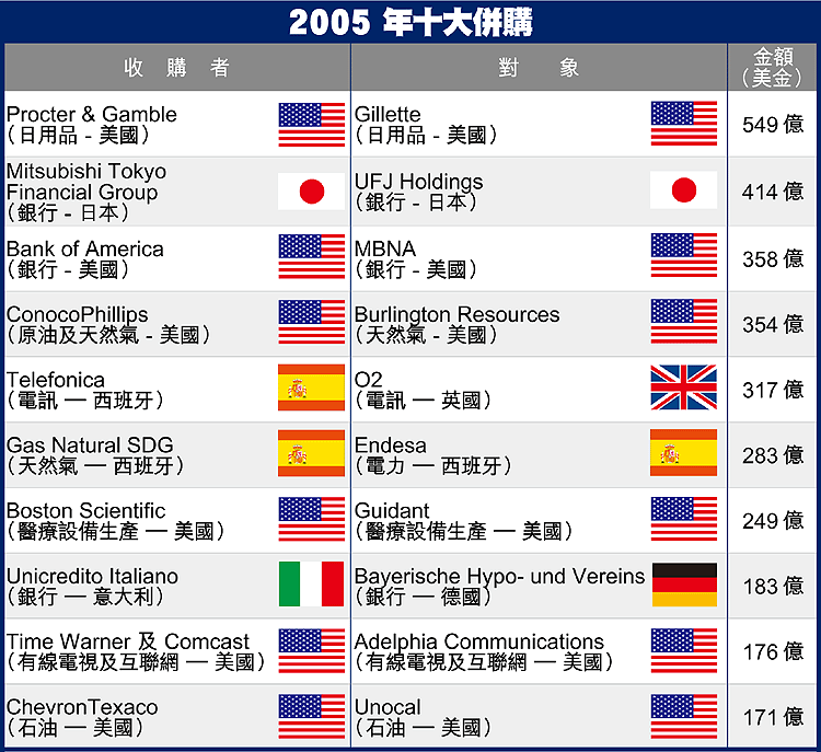 財經資訊研究公司Dealogic報告顯示,05年世界各地主要市場併購活動,回復到2000年科網股熱潮的水平,亞太地區的併購也創歷史新高。除非在可見將來,世界經濟出現巨變,否則併購活動仍然會是市場焦點。