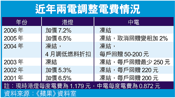 港燈去年大賺近八十六億,其中五十六億來自本港電力供應,但今年仍加價7.2%(見表)。中電除取消電費回贈外,未有正式加價。港燈每度電費較中電高三成半。