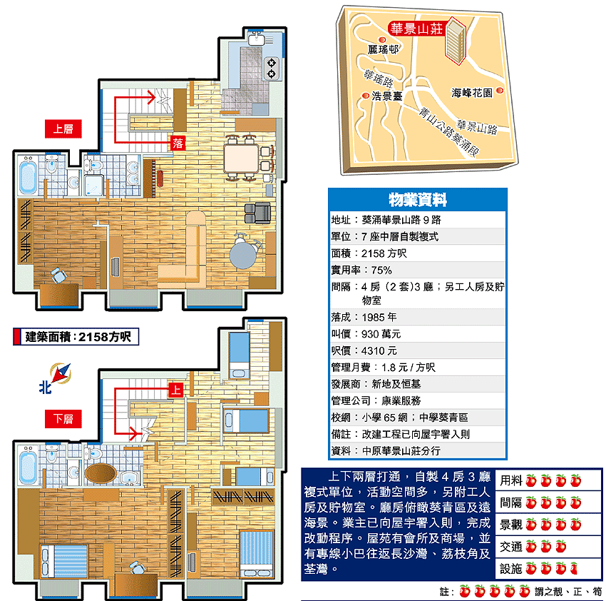 中原李世強表示,華景山莊有數個自製複式單位,只有介紹的這一組放售。該單位已向屋宇署入則申請改裝,連同裝修需時1年,而且所費不菲,但開價算平,每方呎4310元,較一般單位呎價約4000方呎只略高近8%。