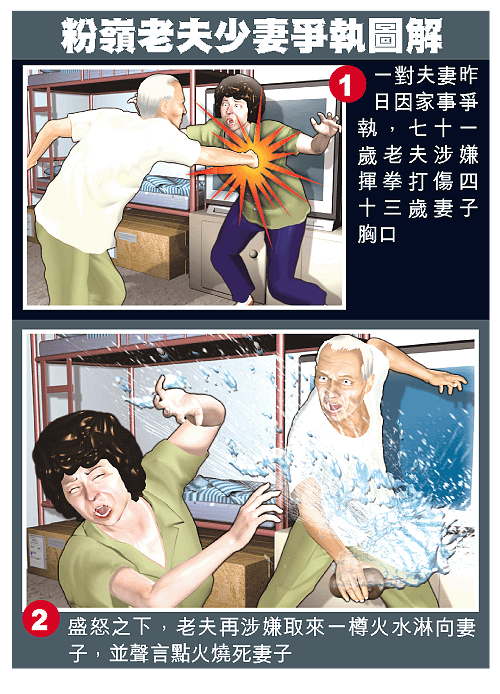 混亂中,這對老夫少妻竟然大打出手,其間馬姓老翁涉嫌揮拳擊向妻子,其妻躲避不及胸口中拳,痛得大叫呼救。惟老翁仍不罷手,竟從廚房取出一樽火水,朝妻子身上迎頭淋去,老翁並揚言點火要將妻子活活燒死,其妻慌忙躲在一旁撥電報警求救,然後繼續與丈夫在屋內對峙。