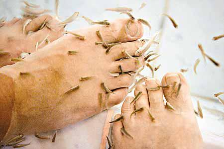 箱根小涌園溫泉最近新開設「魚醫生」浴場,水中一條條只有幾厘米長的小魚兒游來游去,客人將腳浸下,魚兒就會爭相「咬」腳踭、腳甲附近的死皮。這種魚沒有牙齒,就算被咬都不會覺得痛。一名日本客人浸完說:「一點都不痛,只有點癢癢的。」