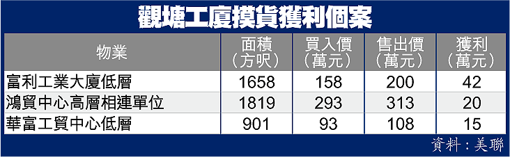 開聯工業中心B座3379方呎單位,以314萬轉手,每呎929元,單位1月成交價270萬,每呎800元,2月再以304萬元成交,每呎升至900元。