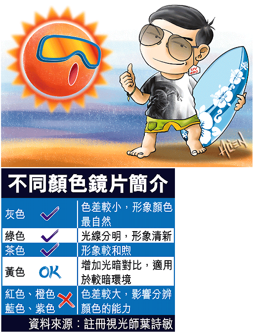 雖然鏡片顏色深淺與阻擋紫外線無關,但由於顏色深會減低透光率,所以可令形象「冇咁刺眼」。但葉詩敏指出,紅色、橙色、藍色和紫色的鏡片雖然「夠潮」,卻會影響眼睛辨別顏色的能力,對駕駛者尤為危險,其中又以藍色及紫色的色差最大。灰色的鏡片則是最佳選擇,因為形象顏色最自然,而綠色和茶色也是不錯的選擇。