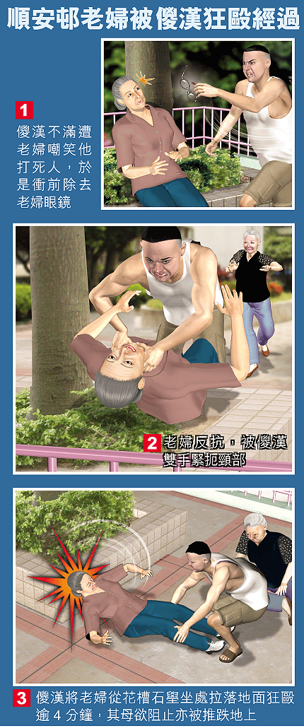 昨午約5時,李散步返家途經安頌樓對開一休憇處時,譚婦與2女街坊坐於花槽石壆,其中1人向李說:「儍仔李,唔好再打人啦,會打死人㗎。」李不滿返家告知母親。兩母子落樓找對方理論,李謂認得是譚婦笑他,但譚否認。爭論間,李突然情緒激動衝前,一手除下譚婦的眼鏡後,雙手緊扼譚的頸項,譚反抗,有人隨即捉着譚婦雙腳,將她從花槽石壆位拖落地面狂毆。街坊說譚婦被拖落地時,後腦曾撞落花槽壆位,再遭儍漢毆打致一度昏迷,但在場20多名老街坊,都不敢上前勸阻,李母擬阻止亦被推跌地上,直至警員趕至喝止李才罷手。