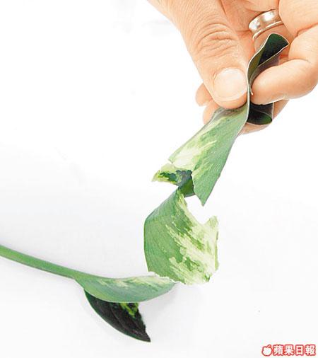 將hairmask放在葉上敷20分鐘,之後用手揸塊葉,睇吓hairmask易唔易被吸收。