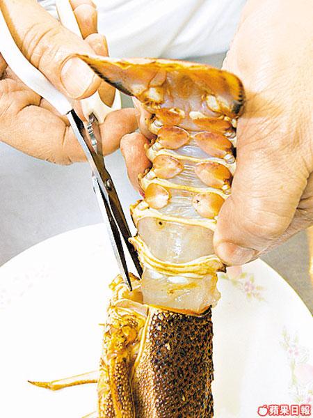 1.先用冰水浸龍蝦約15分鐘,用剪刀取出蝦肉,開背及除腸,加入小量蛋白、生粉等調味;