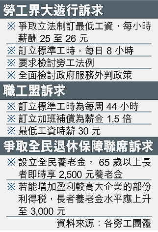 至於由52個團體組成的爭取全民退休保障聯席,昨日也趁五一前夕舉行記者會,要求港府關注打工仔退休問題,增設全民養老金。