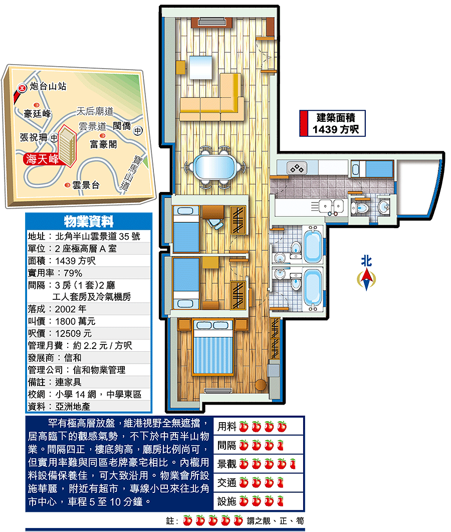 成交方面,3月份2座高層B室,1365方呎,成交價1311萬元,呎價9604元。