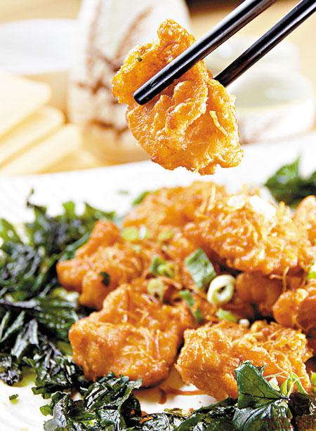 以金椒打茸後鋪在黑豚肉片上,再包住生葱同炸,味道香口,只帶微辣。
