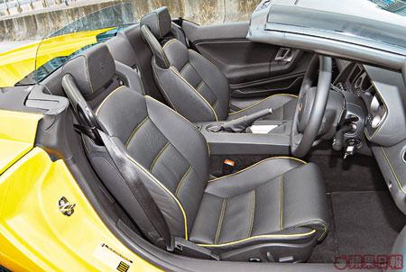 成個以全黑真皮鑲嵌,再加以車身色邊配襯的座艙同桶椅組合;當中最令我注目的地方,肯定係左右加有E-Gear+/-轉檔推桿的三幅式軚環,嗰種依據人體手形嘅設計,仲好有一種予人蠢蠢欲試的衝動;此外,簡潔得如無物的中間波箱位置,一如過往在銀色面板上,有Sport同全自動的Auto按鍵之餘,上方亦新加入有軟篷頂上落電掣,連帶門邊電鏡調校及尾定翼等操控,全掌握在一指之間,真方便!之不過,我更喜歡享受置身於桶椅那份十足承托同靠貼感,就算你猛然踏下油門,亦只會給你有多一份黏背感覺。