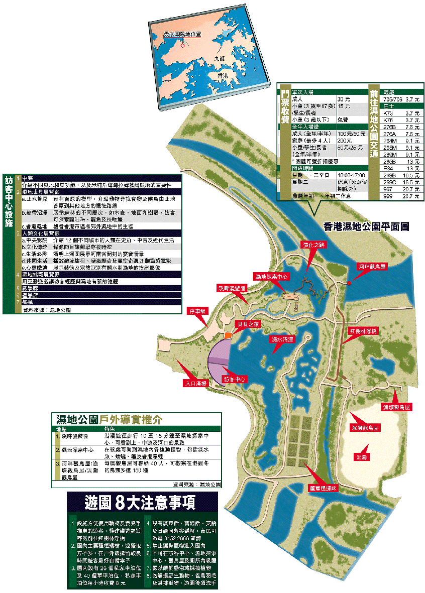 香港濕地公園位於天水圍東北部,園內指示牌具有繁、簡體字、英文及日文解說,該園將於本月第2個星期邀請社會各界人士參與試運,市民可上網查詢有關詳情,團體亦可透過網上預訂門票,有興趣人士可瀏覽網址: http://www.wetlandpark.com。