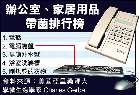【本報訊】會令人傷風、感冒的細菌病毒無處不在。一些外表看來乾乾淨淨的地方,原來正是病毒溫床,被無數人觸摸的門柄、電梯按鈕,原來竟較電話清潔;剛從乾衣機取出、仍散發微溫軟軟綿綿的衣服,其實布滿細菌。專家指教師、會計師、銀行職員及醫生的辦公桌最骯髒,律師的則比較乾淨。